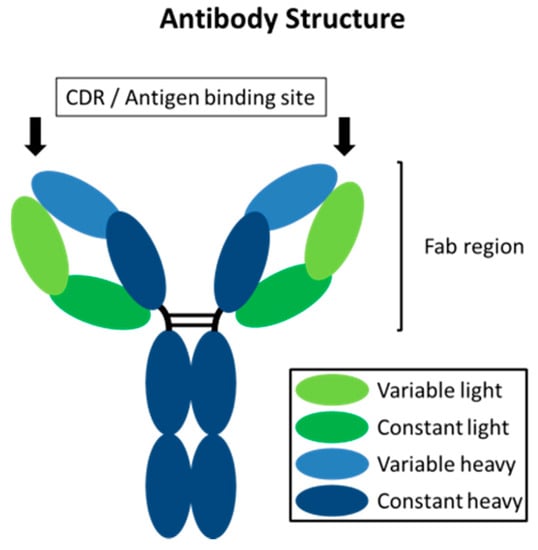 Antibodies represent a means of achieving a high degree of selectivity towards disease-causing biological targets. They are involved in the immune response of an organism to neutralize pathogens, such as viruses and pathogenic bacteria, through binding to their surface with the antigen binding site within the Fab region, as displayed in Figure 1 [,,].