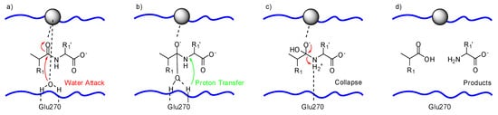 The incoming substrate drives the catalytic, zinc-bound water towards Glu270. The water oxygen ligated to the zinc ion, as shown in Figure 2a, has enhanced nucleophilicity by having both its protons hydrogen bonded to Glu270. Glu270 and zinc promote the attack of water on the carbonyl carbon of the substrate, as shown in Figure 2b. Glu270 accepts a proton from the water molecule and immediately shuttles it to the amide nitrogen at the scissile peptide bond of the substrate, as depicted in Figure 2c. The collapse of the intermediate, displayed in Figure 2d, delivers the hydrolyzed products.
