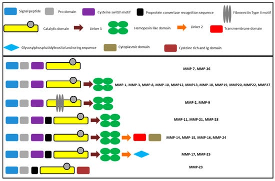 The general composition of matrix metalloproteinases comprises conserved units as well as structural features only found in a fraction of MMPs. All MMPs share a pro-peptide domain of approximately 80 amino acid residues in length, incorporating a PRCGXPD motif interacting with the active site zinc ion to block the catalytic center in the inactive pro-form of the enzyme. The removal of the interacting cysteine, referred to as the cysteine-switch, has to occur for the activation of the proteolytic activity []. MMP-2 and MMP-9 possess three fibronectin type II domains for the interaction with the collagen [] and MMP-23 has a cysteine rich domain []. With the exception of MMP-7, -23, and -26, all isoforms possess a C-terminal hemopexin-like domain composed of about 190 amino acids []. Figure 3 summarizes the schematic composition of the MMPs.