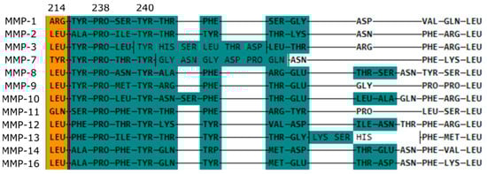 According to this variety, the MMPs can be grouped into members with a small (MMP-1, MMP-7, MMP-11, and MMP-20), medium (MMP-2, MMP-8, MMP-9, MMP-12, MMP-14, and MMP-16), and large (MMP-3, MMP-10, and MMP-13) S1’ pocket. Fabre et al. have reviewed the dynamics of this structural entity for the design of selective small molecule MMP inhibitors []. The green marked amino acids in Figure 5 make up the specificity loop in close proximity to the catalytic zinc(II) ion and the amino acid in position 214 (orange, numbering according to full MMP-3) is located within the S1’ channel. For most MMP family members, this position is occupied by a Leucine, but MMP-1, MMP-7, and MMP-11 possess an Arginine, a Tyrosine, and a Glutamine at this site. Given the steric demand of the sidechains, the available space within the selectivity pocket is limited, resulting in shorter channels for those members. The different sequences in various MMP S1’ channels and the resulting difference in size, shape, and surface property results in substrate specific recognition and simultaneously gives an opportunity for the design of tailor-made selective inhibitors against a certain MMP.