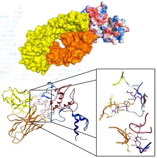 Crystal structure of GS-5745 Fab’ fragment complexed to MMP-9 and a close-up of the interaction site with the interacting side chains of MMP-9 (PDB ID: 5TH9 [], GS-5745 Fab fragments in yellow and orange, and MMP-9 with electrostatic color surface).