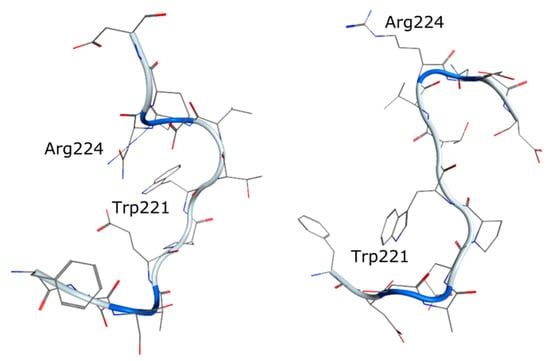 Structural comparison of the loop residues 216–227 in MMP-14. Left: bound to LEM-2/15 (PDB ID: 4P3D) [] and right: the loop conformation of MMP-14 bound to TIMP-1 (PDB ID: 3MA2) []. The observed conformational change can explain the inhibition due to allosteric modification of the enzyme structure.