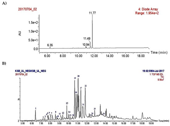 UPLC-PDA (A) and TIC Spectra (B) (LC-QTOF-MS/MS) of Usnea longissima acetone extract.