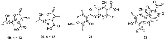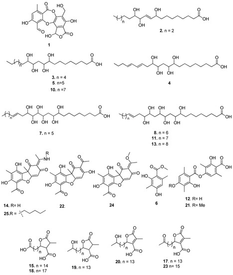 Among 23 compounds identified by MS/MS, five homologous polyhydroxy fatty acids (4, 7, 8, 11, 13), two paraconic acids (15, 18), and two dibenzofuran related metabolites (24 and 25) were identified for the first time. Fragmentation pathways (Supplementary Figures S5–S30), molecular formulas, and HR-MS/MS parameters (Supplementary Table S1) are presented in the Supplementary Material and structures are shown in Figure 2.