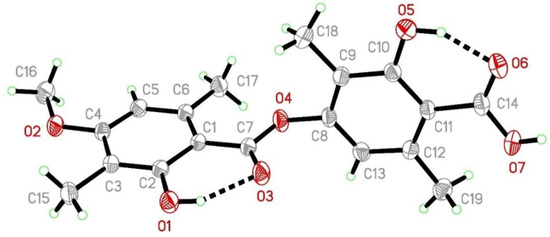 Crystal structure of barbatic acid (21): the molecular structure of barbatic acid, with the atom-numbering scheme. Displacement ellipsoids are drawn at the 30% probability level and H atoms are shown as small spheres of arbitrary radius. Intramolecular hydrogen bonds are shown as dashed lines.
