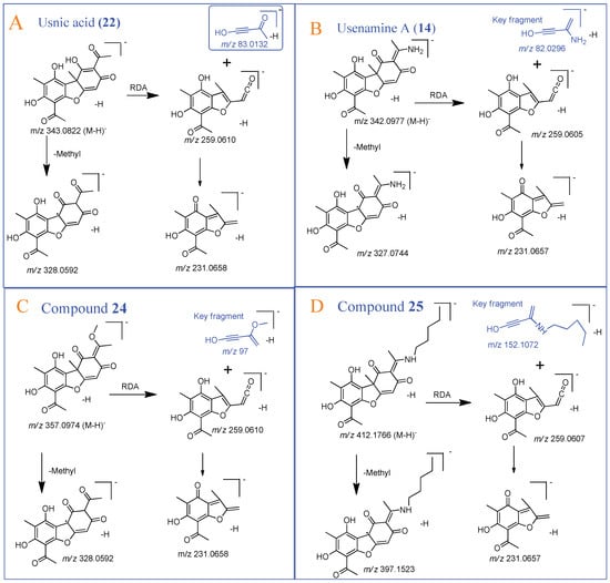 Comparative fragmentation study of (A) Usnic acid (22), (B) Usenamine A (14), (C) Compound 24 and (D) Compound 25.