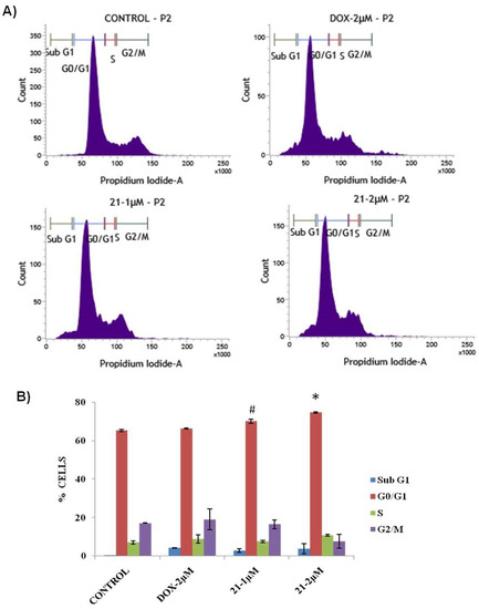Flow cytometric analysis in A549 cells. (A) Control cells and cells treated with Doxorubicin (2 µM) and barbatic acid (21) at 1 and 2 µM concentrations. (B) Bar chart showing the cell cycle phase distribution of A549 cells. Values are mean ± SE, n = 3. Tukey’s multiple comparison test followed by ANOVA was applied to compare the differences. # p < 0.001 (control vs. 21 at 1 µM), * p < 0.0001 (control vs. 21 at 2 µM).