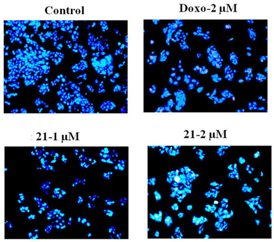 A549 cells were seeded on cover slips and incubated for 24 h. After incubation, cells were treated with doxorubicin at 2 µM and compound 21 at 1 and 2 µM concentrations for 48 h. After 48 h treatment, Hoechst staining was performed using H33258 dye [38]. Florescence images were captured by Olympus microscope using 10X lens.