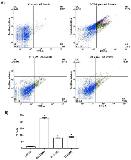 A549 cells were seeded in six-well plates and incubated for 24 h. After incubation, cells were treated with doxorubicin at 2 µM and compound 21 at 1 and 2 µM concentrations and further incubated for 24 h. After 24 h treatment, cells were harvested by trypsinization. After harvesting, cells were washed with PBS at 5000 rpm. After washing, cells were stained with Annexin-V and propidium iodide using Annexin-V apoptosis detection kit (Sigma-Aldrich). Annexin V-FITC assay was performed as described earlier [39].