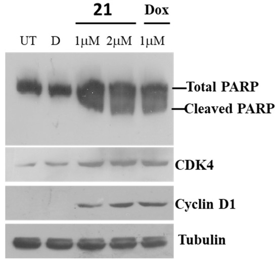 Poly (ADP-ribose) polymerase (PARP) cleavage has been ascribed as one of the hallmarks of apoptosis [34]. Immunoblot analysis revealed that 21 led to robust cleavage of PARP protein similar to doxorubicin treatments (Figure 9). In addition, we analyzed for CDK4 and Cyclin D1 protein levels, as they promote the transition of cell cycle from G1 to S. CDK4 and Cyclin D1 protein levels accumulated in compound 21 and doxorubicin treated cells (Figure 9).