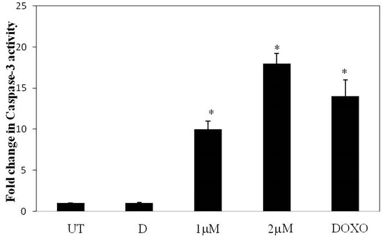 Caspase-3 assay of barbatic acid (21). A549 cells were seeded and treated with 1 and 2 µM of 21. Subsequently, the cells were harvested, and lysates were subjected to cellular caspase 3 analysis. As a positive control doxorubicin was employed. UT represents untreated cells and D is DMSO, vehicle control. Values are mean ± SD, the assay was repeated two times in triplicates (n = 6). * p < 0.05 vs. control is treated as statistically significant.
