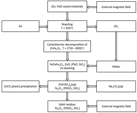In our work a novel combination of pyro- and hydrometallurgical methods for the treatment of waste materials from processing of zinc and lead ores is presented. The thermal and chemical stages of the developed procedure are supported by a magnetic field. Magnetic separation reduces amounts of the chemicals used for the targeted treatment of the zinc-containing fraction. The developed methodology allows one to leach zinc selectively and to form an aqueous solution of zinc salt, leaving out other major metallic constituents present in the material, i.e., iron and lead. The essential idea of the proposed approach is based on a two-step roasting process of the zinc-ferric materials and on employment of the generated gaseous sulfur dioxide (SO2) for the zinc leaching process. Sulfur dioxide dissolved in a suitable amount of water is a factor that enables selective conversion of zinc compounds to aqueous soluble forms. The presence of bonded sulfur in the form of metal sulfides in waste materials gives the ability for easy and cost-effective generation of SO2 by roasting in a chemically non-aggressive environment. The process of selective recovery of zinc does not require any additional raw materials. The only elements needed are energy for heating and water which provides an environment for dissolution of zinc compounds.