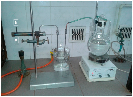 The instrumentation designed for laboratory tests of the method of processing zinc-ferric waste materials: furnace (A) for roasting and carbothermic decomposition of zinc ferrite, air access (B), heat exchanger (C), SO2 water collector (D)—production of leaching agent.