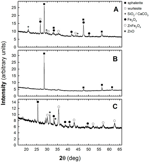 An exemplary set of XRPD patterns were recorded for the test sample no. 1 (see Table 1) after its homogenization, magnetic separation, and roasting process, as shown in Figure 3. The XRPD patterns labelled with letters A, B, and C refer to the initial sample, “non magnetic fraction” (stage I of the processing method), and the residue obtained after the roasting process is completed (stages II–IV), respectively. As it seen in Figure 3A sphalerite is a dominant phase [10] in the zinc-ferric materials. In addition to sphalerite other phases such as wurtesite, quartz, and iron (III) oxide [11] can also be seen. After magnetic separation the peaks related to Fe2O3 phase disappear, as is observed in Figure 3B. Sphalerite becomes practically the only phase in the processed material. The roasting process results in a decomposition of sulfur-bearing zinc-ferric material and a formation of gaseous SO2. The further increase in temperature to 750 °C favors the formation of ZnFe2O4 which, under the reducing conditions, is then converted to ZnO and Fe2O3 phases. The XRPD pattern of the sample at this stage of material processing, presented in Figure 3C, shows dominating peaks around 2θ = 35.5, 32, and 25.5 that correspond to the presence of ZnFe2O4 [12], ZnO [12] and Fe2O3 [11], respectively.