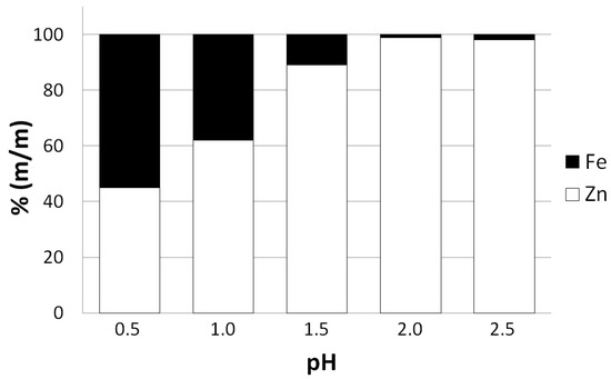 It is worth mentioning that reducing pH of the leaching solution below the recommended value of 2 significantly lowers the selectivity of the zinc leaching process (Figure 4). The obtained precipitate of basic zinc carbonate may be contaminated by iron in a form of iron hydroxide and carbonate and other metals due to their adsorption on the particles of iron hydroxide. Figure 4 reveals that for the lowest pH of the leaching solution employed in the experimental examination (pH = 0.5) iron mass fraction may be comparable to zinc mass fraction in the obtained zinc precipitate.