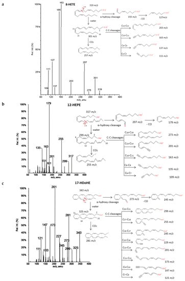 - Kerwin, J.L.; Torvik, J.J. Identification of monohydroxy fatty acids by electrospray mass spectrometry and tandem mass spectrometry. Anal. Biochem. 1996, 237, 56–64. [Google Scholar] [CrossRef]