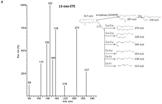 - Murphy, R.C.; Barkley, R.M.; Berry, K.Z.; Hankin, J.; Harrison, K.; Johnson, C.; Krank, J.; McAnoy, A.; Uhlson, C.; Zarini, S. Electrospray ionization and tandem mass spectrometry of eicosanoids. Anal. Biochem. 2005, 346, 1–42. [Google Scholar] [CrossRef]