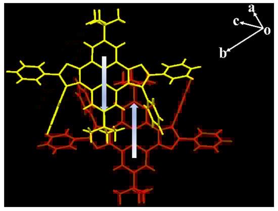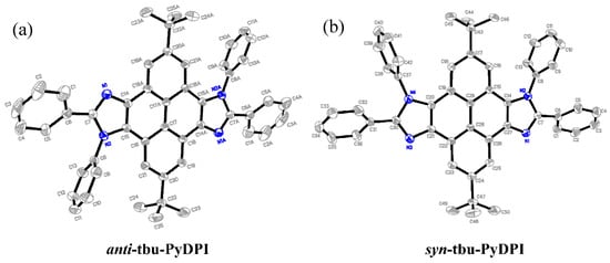 The derived crystal structures are shown in Figure 3 with selected molecular parameters provided in Table S1. As depicted in Figure 3, both crystals crystallized in a monoclinic space group P 21/c. The anti/syn-tbu-PyDPI crystals had an essentially planar core and pyrene–imidazole ring, while their formed molecular columns packed in a herringbone fashion for both of them. The anti-crystal contained only two molecules in the unit cell while there are four molecules in the syn-crystal which exhibited a more ordered arrangement of the anti-part. Due to the axisymmetric configuration of syn-tbu-PyDPI which can create an induced dipole along the short axis direction (Figure 4), it is proposed that formation of alternating the antiparallel arrangement in a flat dimer of one unit cell was driven by the dipole–dipole interactions [37], referring to the pyrene–imidazole unit with an interfacial distance of ca. 4.89 Å. Because of the steric hindrance effect of tert-butyl, the adjacent molecules adopt a slip-stacked stacking mode along the short molecular axis and the long molecular axis synchronously to some extent (Figure 4).