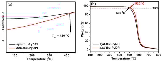 Such a dual five-membered-ring skeleton demonstrated high thermal stability. From their thermogravimetric analysis (TGA) graphs, anti-tbu-PyDPI and syn-tbu-PyDPI exhibited outstanding thermal stability with decomposition temperature (Td) (5% weight loss) as high as 520 and 500 °C, respectively (Figure 8). The single pyrene–imidazole unit already revealed high thermal stability [28,29], and the centrosymmetric structure of anti-tbu-PyDPI further increased the thermal stability of the material. In differential scanning calorimetry (DSC) heating cycles up to 450 °C, anti-tbu-PyDPI did not show any thermal transition, which was due to its highly rigid structures and multi-intermolecular interactions (Figure S2). Tm appeared at 420 °C for syn-tbu-PyDPI, which reflects that an axisymmetric structure shows better molecular flexibility than a centrosymmetric structure due to the comparatively lower Td of syn-tbu-PyDPI.