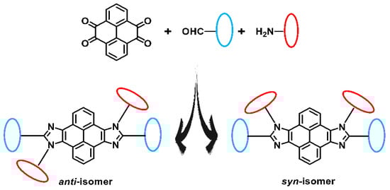 - Ma, B.B.; Peng, Y.X.; Zhao, P.C.; Huang, W. cis and trans Isomers distinguished by imidazole N-alkylation after Debus-Radziszewski reaction starting from 2,7-di-tert-butyl-pyrene-4,5,9,10-tetraone. Tetrahedron 2015, 71, 3195–3202. [Google Scholar] [CrossRef]