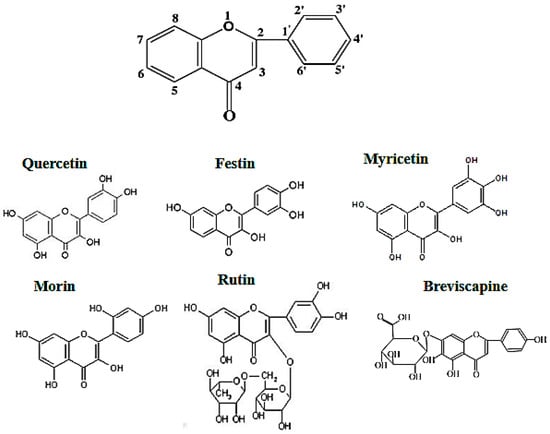 Flavonoids are able to scavenge free radicals as antioxidants by donating a hydrogen atom. The antioxidant activity of flavonoids is related to the number of hydroxyl groups and their structure. This includes: (i) the presence of an ortho-hydroxyl group in the B ring; (ii) the presence of a C2-C3 double bond in the C ring; (iii) or the presence of a C-3 hydroxyl group [40,41,42]. As shown in Table 2, the 1,1-diphenyl-2-picrylhydrazyl (DPPH) radical scavenging activity of the six compounds is in the follow order: quercetin = festin > myricetin = morin > rutin > BHT ≈ breviscapine. Quercetin and festin had the most potent radical scavenging capacity.