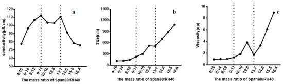 (a) Conductivity, (b) size, (c) and viscosity of the Span60-RH40 system in different mass ratios.