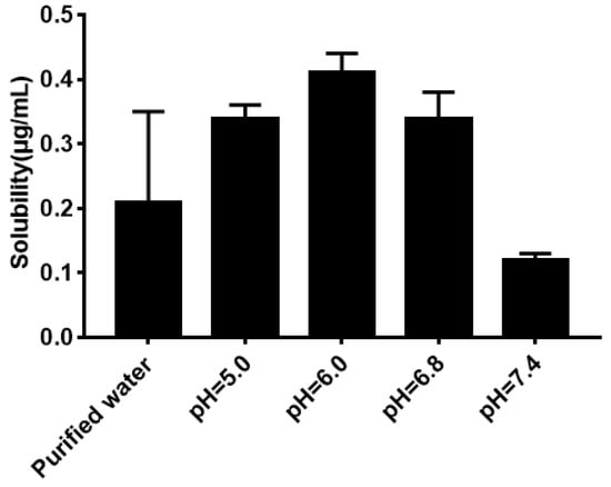 The water solubility of quercetin was measured with 15 mL of purified water, phosphate buffers with different pH values (pH 5.0, 6.0, 6.8, 7.4, 8.0), and excess quercetin, and placed into vials. The vials were shaken for 24 h in a 37 °C water bath and the supernatant was determined by HPLC after centrifugation.