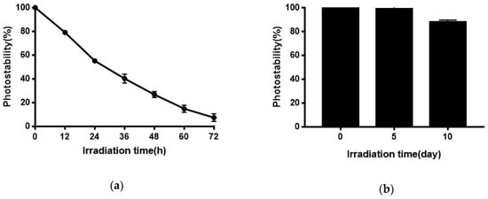 Quercetin has poor photostability and quickly degrades under exposure to sunlight or UV irradiation [46,47,48], possibly because quercetin undergoes photooxidation upon UV irradiation [49]. However, photostability is necessary for quercetin to show its activities. As shown in Figure 8, niosomes effectively improved the photostability of Quercetion and remained 88.06% after 10 days of exposure to strong illumination. Quercetion was protected from UV irradiation because it was encapsulated in the bilayers of niosomes.