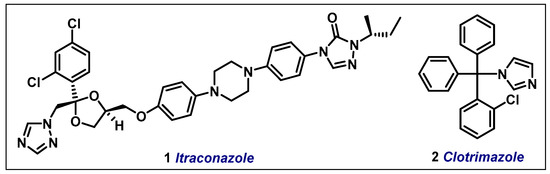 The treatment of both feline and human sporotrichosis is based on the use of itraconazole 1, which contains the 1,2,4-triazole scaffold in its structure and inhibits the synthesis of sterol, a vital component of the fungus cell membrane [5,6]. Clotrimazole 2, on the other hand, is an imidazole derivative with antifungal activity that is only indicated for topical use due to its toxicity (Figure 1). Similarly to itraconazole, clotrimazole is a synthetic antifungal and its mechanism of action involves the inhibition of sterol biosynthesis [7]. In this sense, Gagini et al. [8] reported the effectiveness of the combination of itraconazole with clotrimazole against S. brasiliensis yeasts (the infective form) from feline and human sporotrichosis isolates, suggesting that clotrimazole by itself or in combination with itraconazole is potentially a new option for the treatment of sporotrichosis.