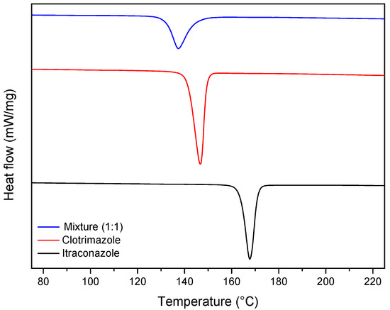 The DSC curves of the drugs showed endothermic peaks attributed to the melting of the drugs between 158.5 and 175.0 °C (ΔH = 31.5 J g−1) for itraconazole and 136.8 and 153.1 °C (ΔH = 41.6 J g−1) for clotrimazole. On the other hand, a single endothermic event was observed in the DSC curve of the binary mixture, starting at 127.7 and finishing at 137.1 (ΔH = −25.35 J g−1), which suggests a strong interaction between clotrimazole and itraconazole (Figure 3).