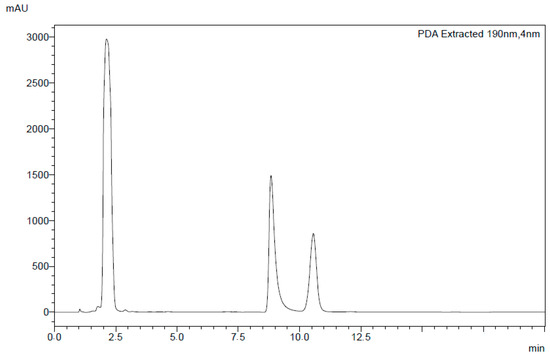 In this context, HPLC-DAD (diode array detector) was selected as an analytical tool for the simultaneous quantification of clotrimazole and itraconazole in the developed microemulsion through a rapid, simple, and isocratic method [20]. In our study, the best separation condition was achieved using a C18 analytical column with a mobile phase composed of acetonitrile and a phosphate buffered saline 0.05 M (pH 8.0 with ammonium hydroxide 1 M) in the ratio (v/v) 60:40, respectively, with a 1 mL min−1 flow rate and UV detection at 190 nm. A typical chromatogram is presented in Figure 5, with a retention time of 9.1 min being observed for clotrimazole and 10.9 min for itraconazole.