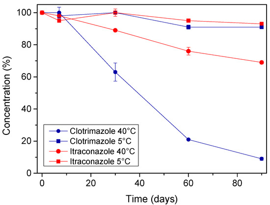No changes were observed in the drug concentrations of the stock solutions under storage conditions. Indeed, further analyses showed that the percent recovery of clotrimazole and itraconazole were, respectively, 97.3% ± 3.15 and 91.3% ± 2.71 at room temperature (25 °C) and 94.2 ± 0.34 and 88.7 ± 1.63 under refrigeration (−5 °C, Table 4). Moreover, the drugs were stable for at least 30 days under storage conditions, with RSDs below 8%.