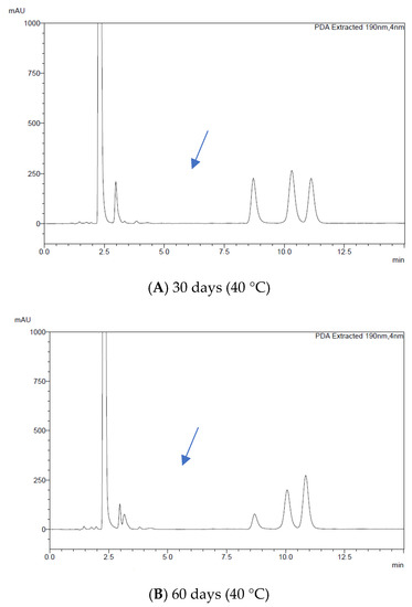 HPLC chromatograms for the samples in the stability study after (A) 30 days, (B) 60 days, and (C) 90 days.