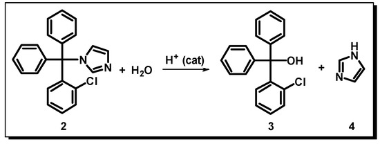 In order to investigate the formation of this compound, which might be a result of the interaction between clotrimazole and itraconazole, we conducted further studies. Initially, we sought to investigate which degradation products could be formed from the degradation of both drugs and found that the degradation of clotrimazole is well-reported under acidic conditions, giving product 3 (Figure 10).