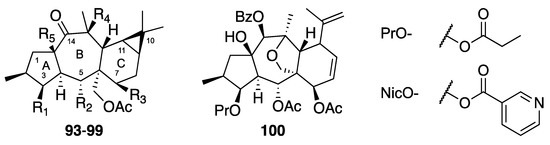 Myrsinane and premyrsinane diterpenes possess a 5/7/6-fused tricyclic or a 5/7/6/3-fused tetracyclic skeleton, respectively. Rings A and B and rings B and C are trans-fused in both series, and an additional cyclopropane ring is present in premyrsinanes. Myrsinanes generally possess ester groups at positions C-3, C-5, C-7, and C-15, and a double bond between C-8 and C-9. In premyrsinanes, an hemiacetal ring or a 13/17-epoxy function can be present [5]. Seven premyrsinols (93–99) and one myrsinol (100) (Figure 5) were evaluated on the CHIKV-cell-based assay (Table 4). None of the compounds tested except compound 98 (EC50 = 11 µM, SI = 5.8) showed significant anti-viral activity. In the premyrsinol series, all compounds but 98 possess an ester group at C-7. It was suggested that this ester group could have a deleterious effect on anti-CHIKV activity [29].