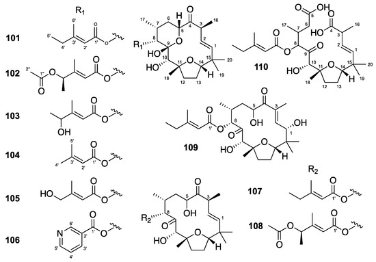 Flexibilanes are rare 15-membered macrocyclic diterpenes that possess an intramolecular furan, a hydroxy group in position 10 and a side chain in position 8. In general, a pyranol ring complement their structural features. The structure of flexibilanes is rigid due to strong internal hydrogen bonds between the hydroxy group at C-10 and the ester oxygens of the side chain. The presence of five methyl groups on the macrocycle increases the rigidity of the flexibilanes [42,43]. Among the 10 flexibilanes evaluated (101–110) (Figure 6), tonantzitlolones B, C and F (102, 103 and 106) showed moderate anti-CHIKV activities with EC50 values of 12, 24 and 19 µM, and SI = 10.2, >9 and 3, respectively (Table 5) [27]. Compound 106 also showed moderate anti-SINV and anti-SFV activities.