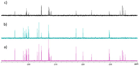 The wide range of chemical shifts displayed by the 19F nucleus permits the identification of every fluorine-containing monosaccharide within the complete mixture in a straightforward manner, using a standard proton decoupled 19F spectra. Both α- and β-anomers are perfectly distinguished for every sugar. Therefore, the spectrum of the mixture contains 26 different 19F-NMR signals (13 distinct fluorine-containing monosaccharides and two anomers of each, Figure 1).
