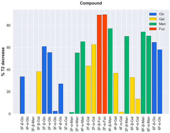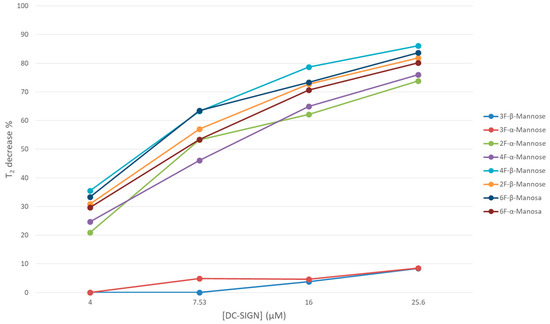 Fluorinated monosaccharides that display effective binding to DC-SIGN and observed averaged decrease in T2. These values are qualitatively related with the relative binding affinity: Fuc moieties interact better, followed by Man [13]. The Gal moieties displayed a small change in the observed averaged decrease in T2,free, highlighting that they are rather poor binders of DC-SIGN [13]. The average T2,free was calculated for all the species depending on the particular sugar. The average T2 decay % was computed for those species that exhibited a T2 decay over 40%.
