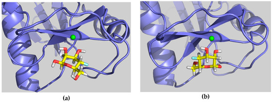 Representative structures of β-4-F-Man binding pose A, mimicking Fuc (a) and binding pose B, mimicking Man (b).
