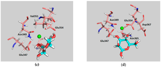 Interestingly, both simulations displayed rather different behaviors. When binding pose A was used as a starting geometry, the α-Man moiety is able to switch its pose along the MD trajectory (after approximately 100 ns), adopting the binding mode described for Man in the available X-ray crystal structure of PDB 2IT5 (Figure 7). In fact, as mentioned above, this interchange between the two binding poses (the one of the crystal structure and binding pose A) takes place regardless of the starting geometry used. Thus, α-Man in binding pose A turns around the O3-Ca2+ bound axis, to find the usual binding pose that shows the direct interaction of the equatorial OH-3 and OH-4 hydroxyl groups with the Ca2+ ion. Nevertheless, during the first 100 ns of simulation where binding pose A takes place, the observed protein–sugar interactions (Table S4) resemble those described above for α-Fuc, with the corresponding geometry changes (C1Man–C5Fuc and C2Man–C4Fuc, Table S2). Stabilizing hydrogen bonds between Man OH-4 (as donor) and Glu354 are predicted, accompanying those involving α-Man OH-2 and OH-3, as well as hydrophobic contacts between α-Man H-4 and Val351. In particular, α-Man OH-4 only acts as a hydrogen bond donor, while α-Man OH-3 acts as both a donor and an acceptor. In the second part of the simulation, α-Man adopts the presentation described in the X-ray complexes, and O3 and O4 now coordinate the Ca2+ ion (Table S5). The analysis of the interactions during the whole simulation is gathered in Table S6 and Figure S1. Obviously, the most populated hydrogen bond contact is that between α-Man OH-4 and Glu354, shared in both binding modes (Figure S2), which takes place for 99% of the time the complex remains bound.