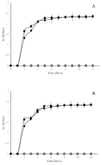Effect of starch edible films added with selected concentrations of Mexican oregano (Lippia berlandieri Schauer) essential oil (control [■], 0% [●], 1% [☐], and 2% [⭘]) on Fusarium spp. growth with different nanocomposites, bentonite (A) or halloysite (B).