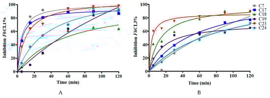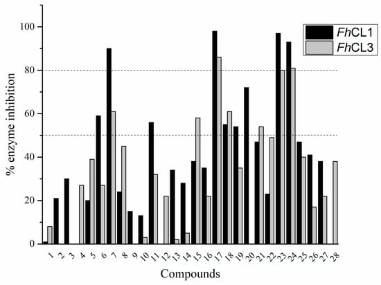 4.2. FhCL1 and FhCL3 Inhibition Screening