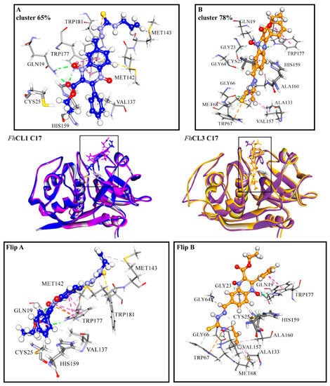 4.4.2. Ligand-Protein Molecular Docking to Predict the Binding Site into FhCL1 and FhCL3