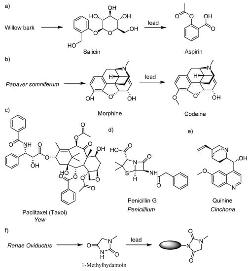 Examples used natural product (NP) resources in drug discovery. (a) Aspirin was developed from natural product salicin. (b) Codeine was prepared using morphine as the lead compound. (c) The anticancer drug paclitaxel was isolated from yew. (d) and (e) Penicillin G and quinine were isolated from Penicillium and Cinchona respectively. (f) The strategy of developing dual-active agents using a natural product lead compound 1-methylhydantoin.