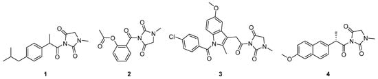 Optimization of lead compound 1-methylhydantoin (1-MHD). The hydrophobic moieties were selected from nonsteroidal anti-inflammatory drugs. The designed 1-MHD derivatives were ibuprofen conjugated 1-MHD (1), aspirin conjugated 1-MHD (2), indomethacin conjugated 1-MHD (3), and naproxen conjugated 1-MHD (4).