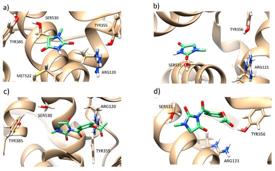 (a) and (b) Binding model of 1-MHD with cyclooxygenases-1 (COX-1) and cyclooxygenases-2 (COX-2). (c) and (d) Binding model of 2 with COX-1 and COX-2.