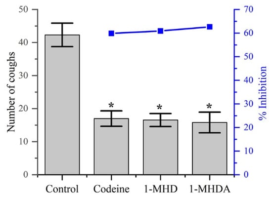 As shown in Table 1 and Figure 5, 2 obviously reduced the number of coughs in the ammonia-induced cough model compared to the control group. On the other hand, there was no significant difference in the frequency of coughs between the groups treated with codeine phosphate (30 mg/Kg), 1-MHD, and 2 (100 mg/Kg). The inhibition rate of groups with treatments of codeine phosphate, 1-MHD, and 2 appeared to be between 59 to 62%.