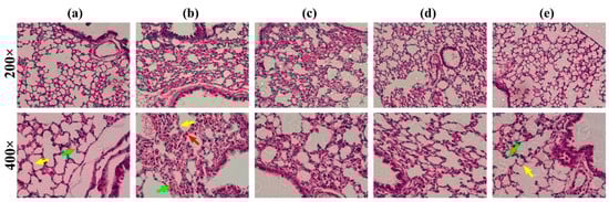 Lung tissue histology analysis. (a) Representative hematoxylin and eosin-stained mouse lung sections with control group. (b) Mouse lung sections of PM 2.5 group. Arrows point out the thickened alveolar septum, dilated telangiectasia, and neutrophil. (c), (d), and (e) Mouse lung sections with treatment of 1-MHD, ASP, and 2, respectively. Note: Red arrow, neutrophil; yellow arrow, alveolar septum; green arrow, capillaries.