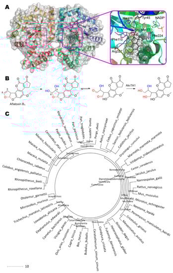 (A) Structure of aflatoxin dialdehyde reductase AKR7A1 (PDB 1gve) containing aflatoxin B1 in its active center, and (B) scheme of substrate conversion with AKR7A1. Position and geometry of substrate binding was determined using molecular docking with Autodock Vina as described [15] (see Appendix A for details). Molecular surface of substrate was calculated using Gamess-US as described [16] and is shown as mesh. Within reaction scheme, OH-groups marked with blue are introduced by cytochromes, and oxygens marked with red are modified by AKR7A1. (C) Phylogenetic tree of organisms possessing homologous enzymes found with BLAST.