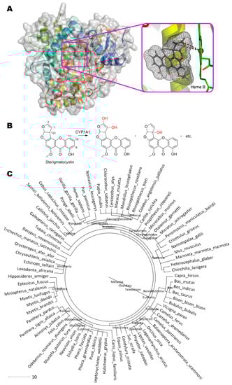 (A) Structure of cytochrome P450 (PDB 4i8v) containing sterigmatocystin in its active center, and (B) scheme of substrate conversion with cytochrome. Position and geometry of substrate binding was determined as described early. (C) Phylogenetic tree of organisms possessing homologous enzymes found with BLAST.